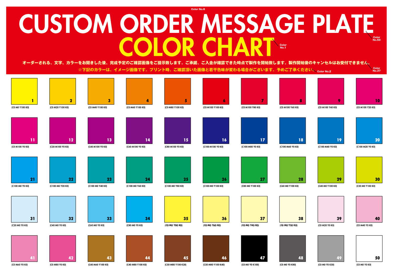 Put the amount of item needed in the cart of our Online Shop. When you confirm your order, please reference the image below and enter the Color, Text and Text color in the remarks column.※Depending on the amount you order, price per item changes. Please check the amount and price before order.