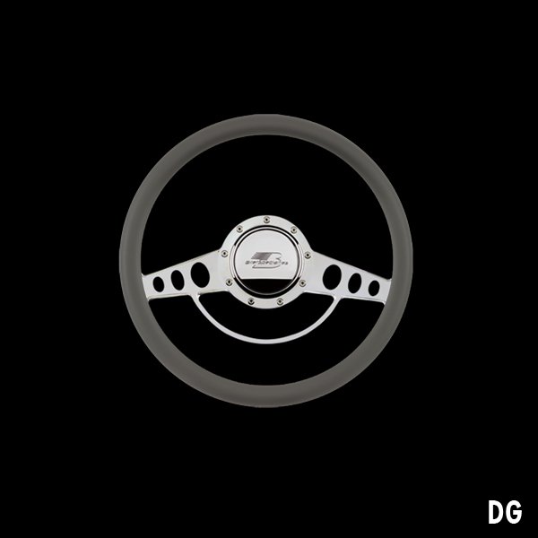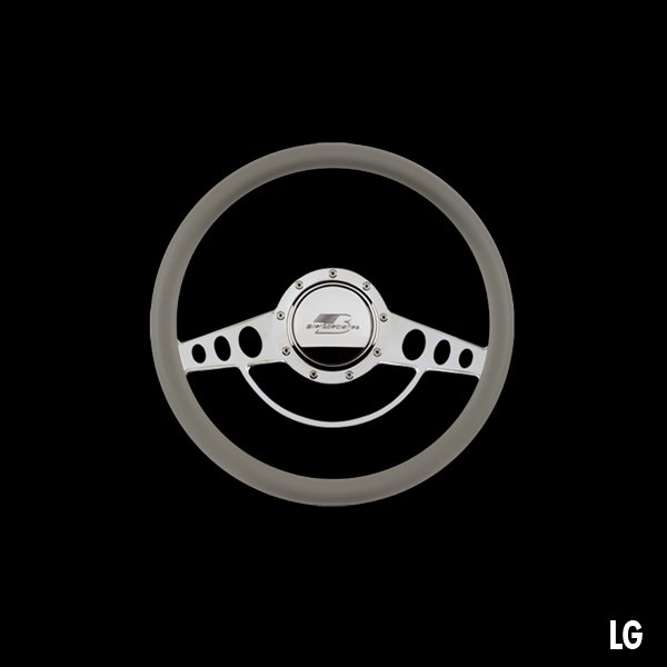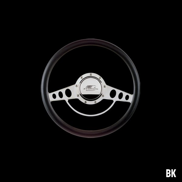 The steering wheel features a seamless (no seams) half-wrap leather grip. The front half leather and the back half is billet aluminum with finger grooves. Size is 14 inches (35 cm) in diameter and available in 5 colors.