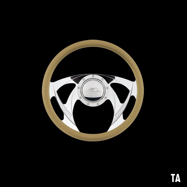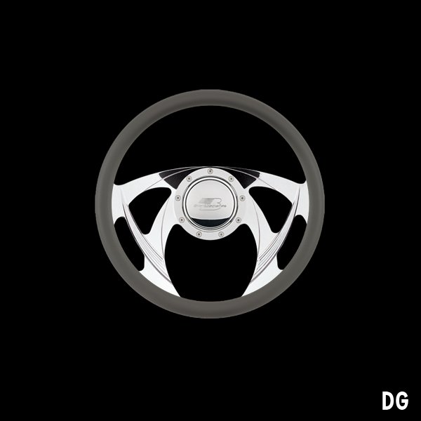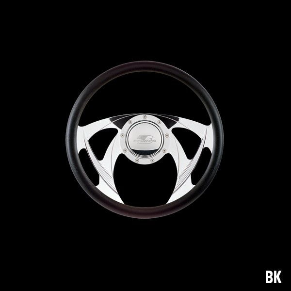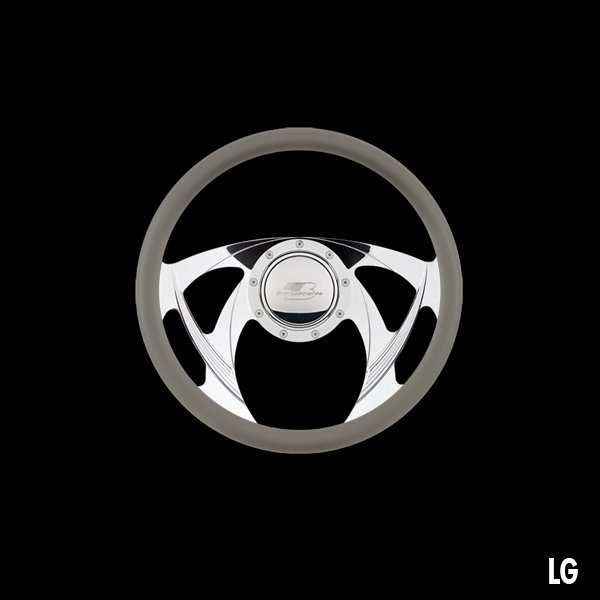 The steering wheel features a seamless (no seams) half-wrap leather grip. The front half leather and the back half is billet aluminum with finger grooves. Size is 14 inches (35 cm) in diameter and available in 5 colors.
