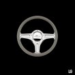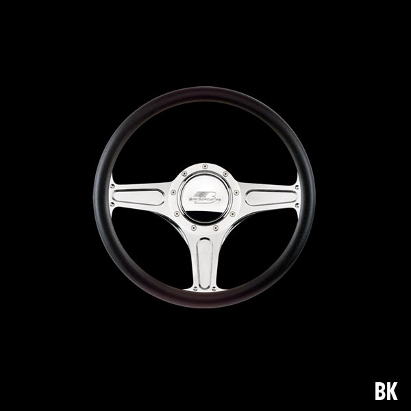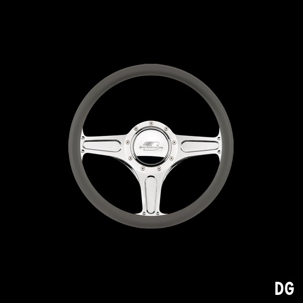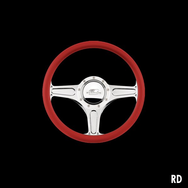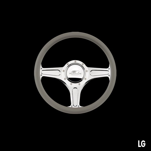 The steering wheel features a seamless (no seams) half-wrap leather grip. The front half leather and the back half is billet aluminum with finger grooves. Size is 14 inches (35 cm) in diameter and available in 5 colors.