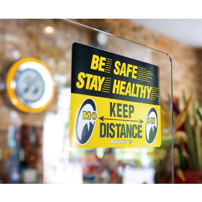 With the visible coloring of Black x Yellow, it is a message sticker with the message of BE SAFE STAY HEALTHY KEEP DISTANCE. It is a rare design with the MOON Eyeshape logo taking a distance.