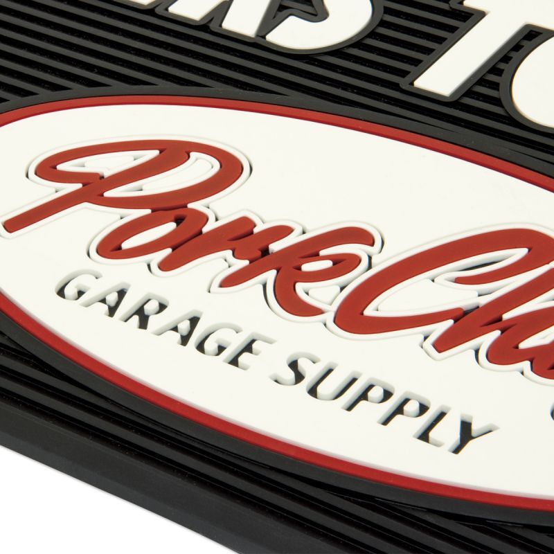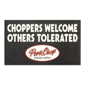 A rubber welcome mat of PORKCHOP GARAGE SUPPLY. "CHOPPERS WELCOME OTHERS TOLERATED" and the logo are desgined. It is made from rubber so, you can easily clean it with water.