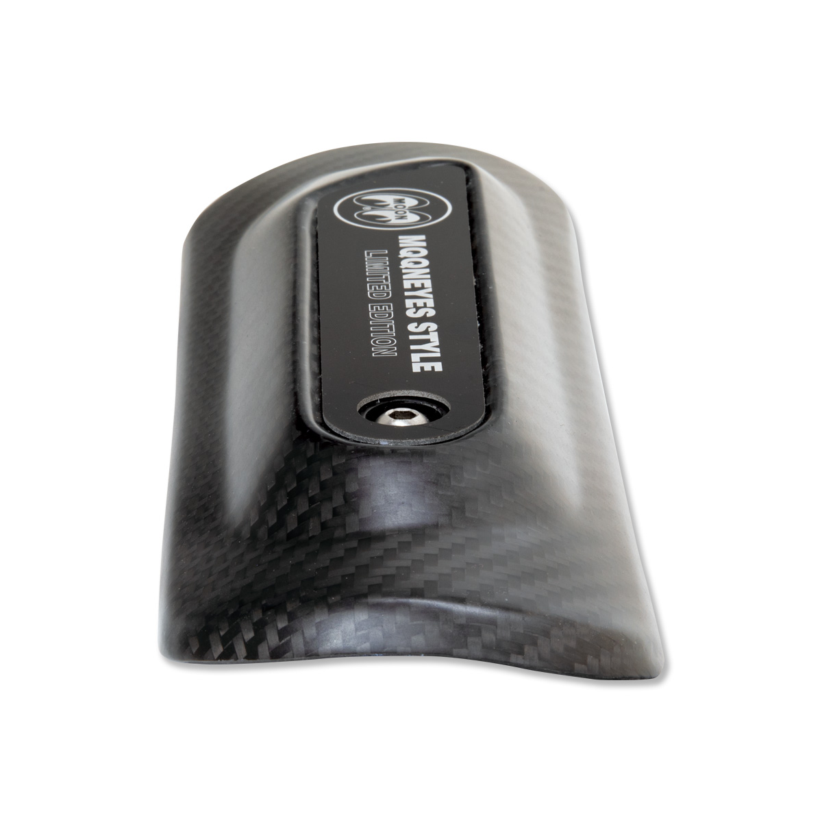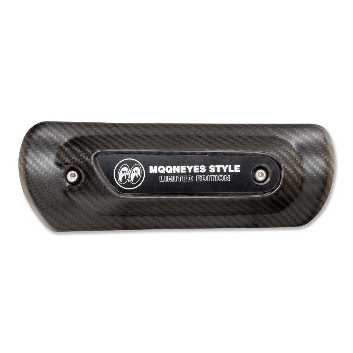 Remove the genuine exhaust cover and use the bolt and nut to install it to the hole of the heat guard. There is the MOONEYES logo and MOONEYES STYLE LIMITED EDITION designed plate on the Protector. Black carbon Protector will make the muffler LQQKS CQQL!