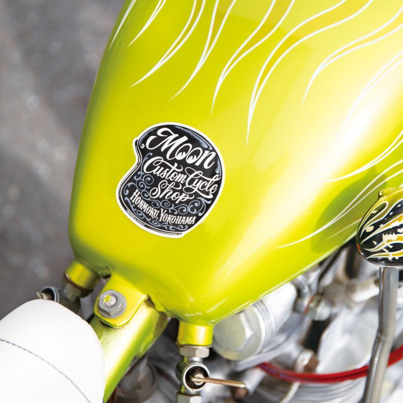 A Sticker of MOON Custom Cycle Shop (MCCS). The helmet is the must-have for a biker and on that helmet, Widman’s stylish lettering and pinstripe are designed.