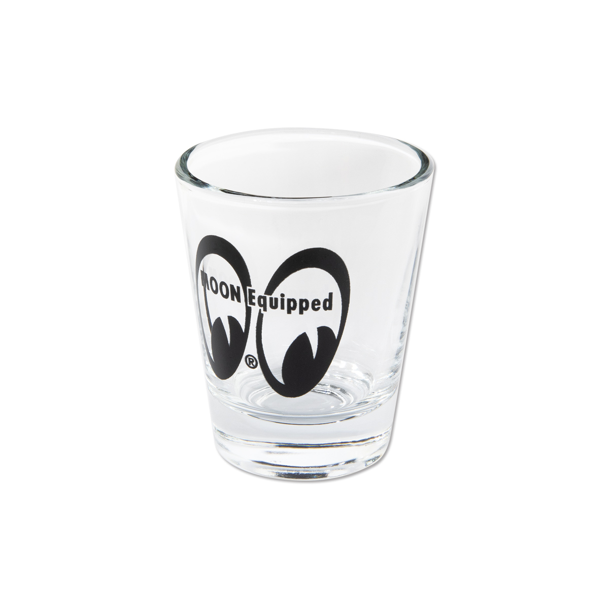 The shot glass with MOON Equipped eye shape logo printed on the front.