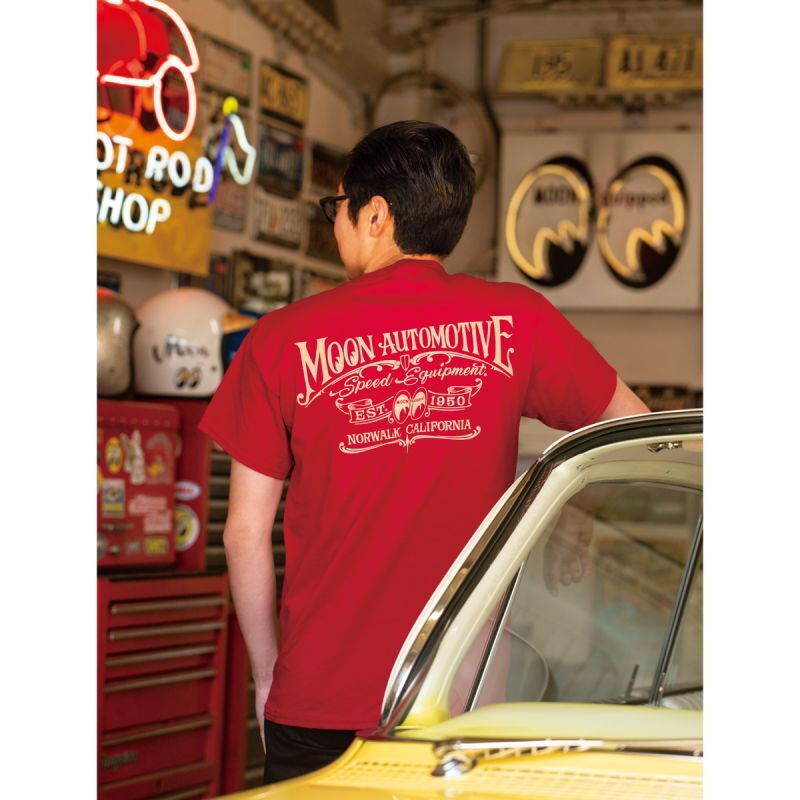 MOON Automotive Speed Equipment design of standard shape t-shirt, with 50's classical style designed by Wildman.