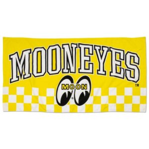 A bath towel featuring MOONEYES. MOON eyeshape logo and the checker pattern.