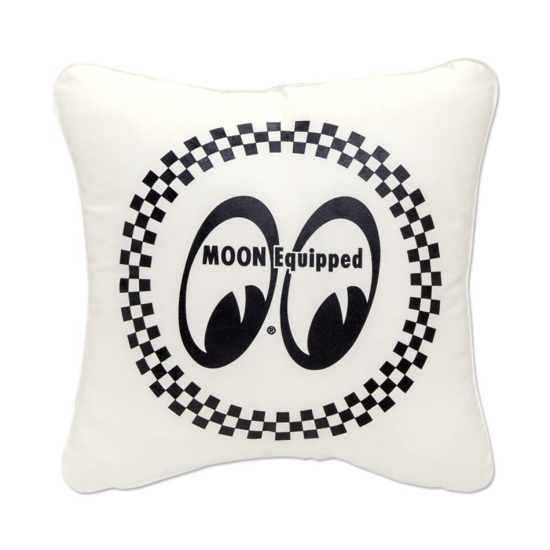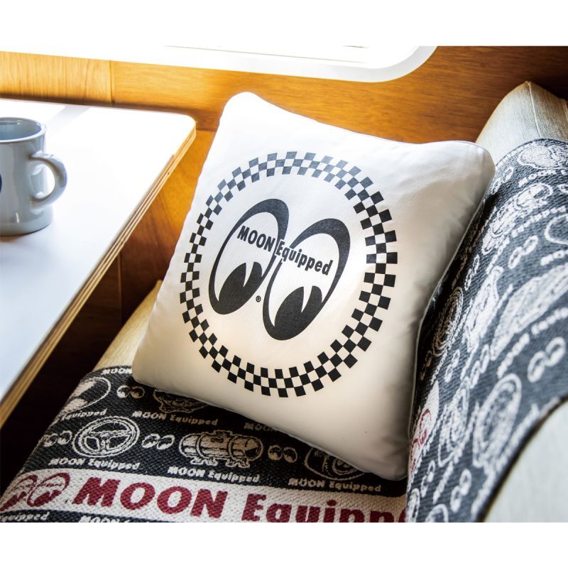 The orthodox design cushion cover with a checker pattern surrounding the MOON Equipped Eyeshape logo.