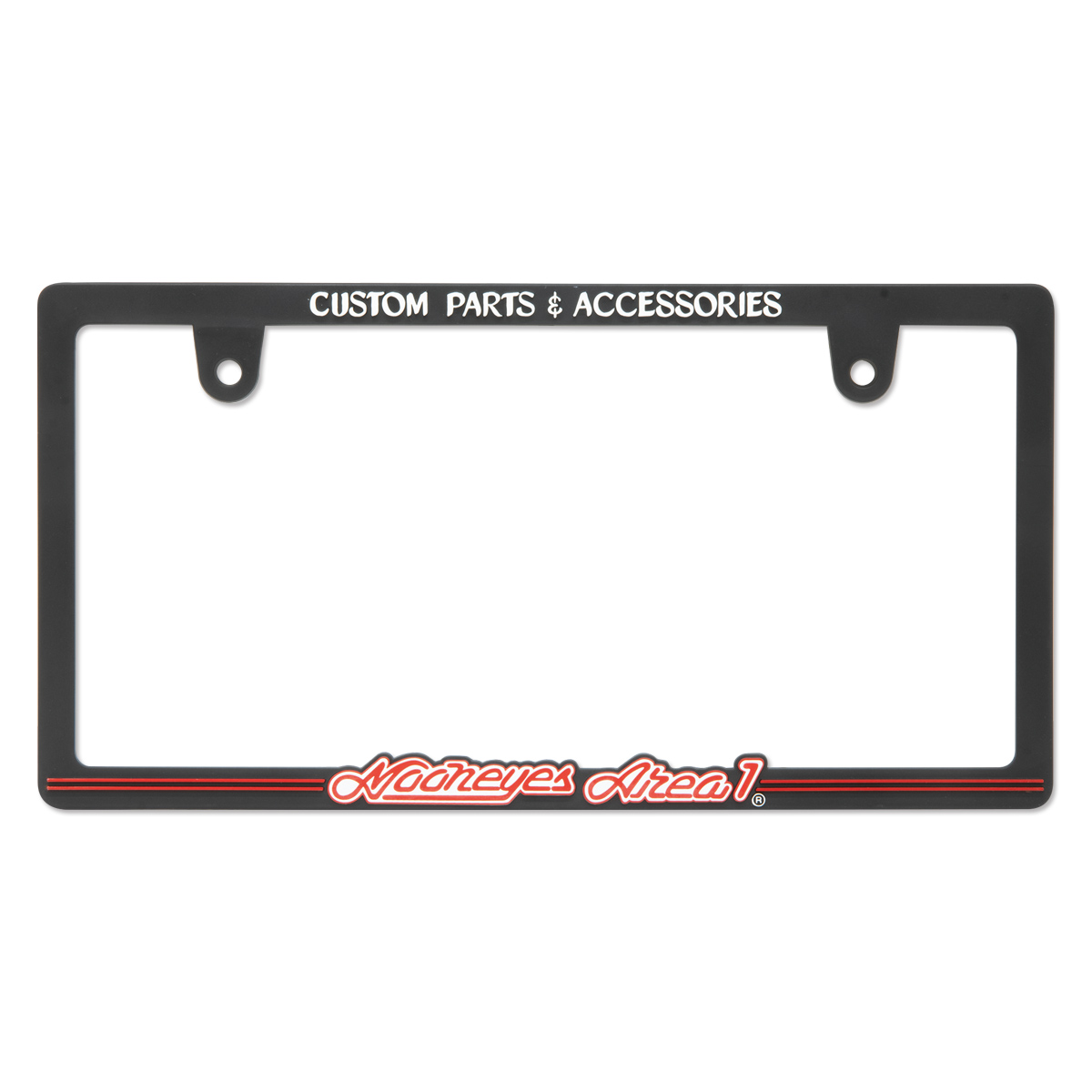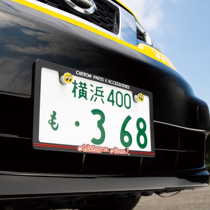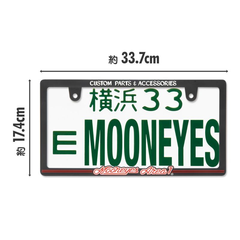 The Japanese size license plate frame features the raised MOONEYES Area-1 logo accented with the iconic Red color.