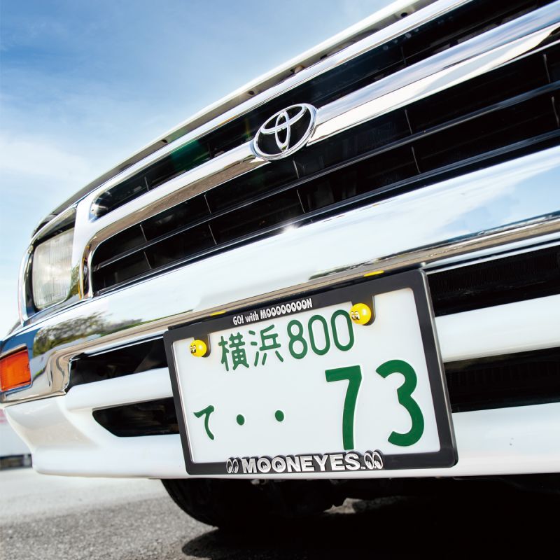 The Japanese-size license plate frame features a chromed MOONEYES logo.