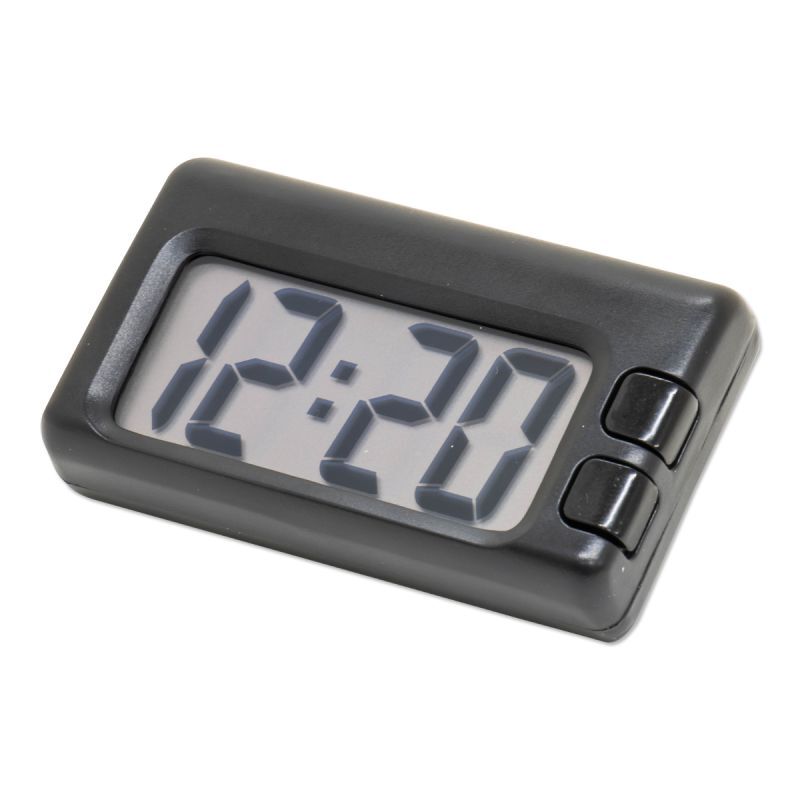 It displays hours, minutes, seconds, and the date. Mount using the included support stand or Velcro tape.