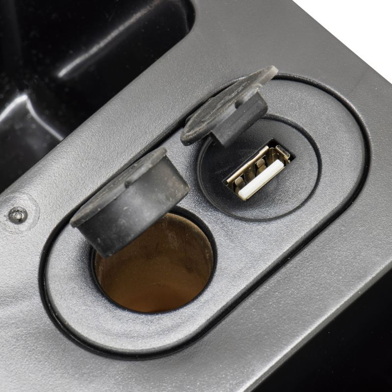 It's an organizer where you can place personal items and drinks nearby, featuring a 12V and 2.4A high-speed USB charging capability.