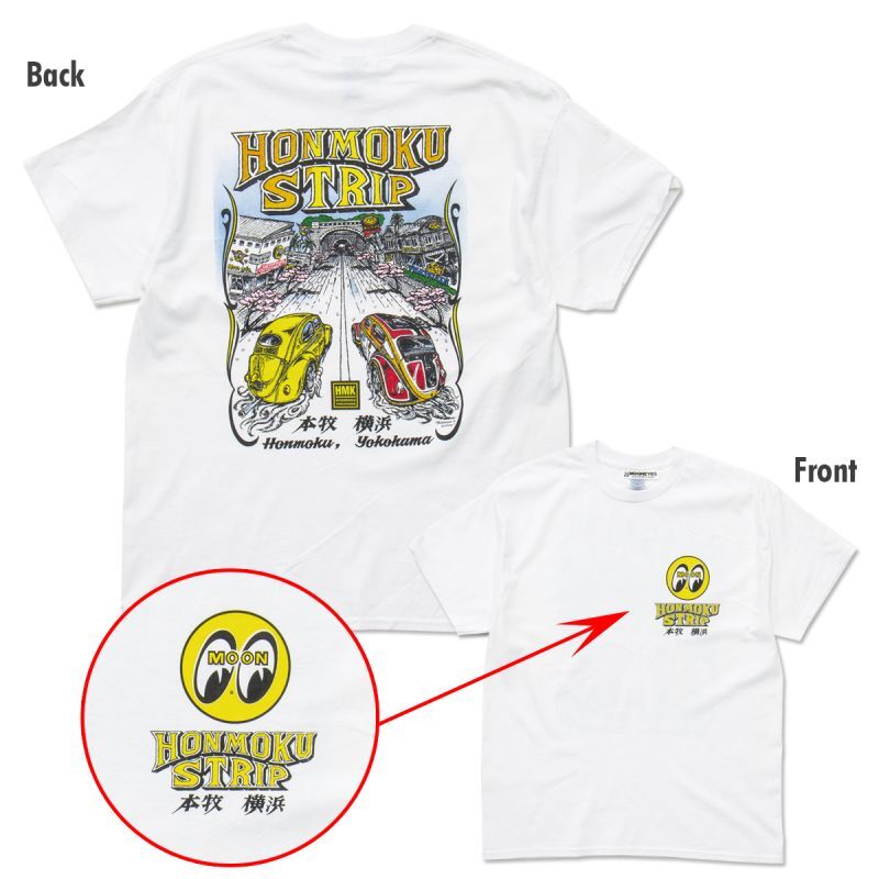The T-shirt illustrated by Wildman Ishii, which depicts the "MOONEYES" and "FLAT 4" has their base in Honmoku Yokohama, reminiscent of a drag strip.