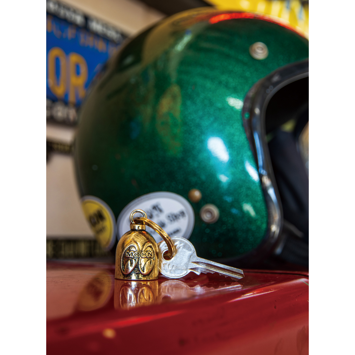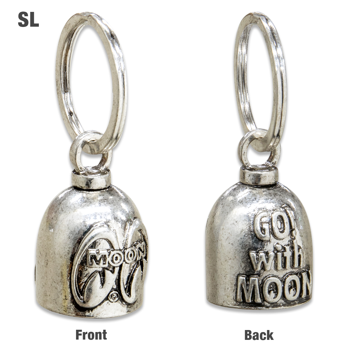 MOON Bell key ring with embossed detailing of MOON eyeshape logo and GO! with MOON design.