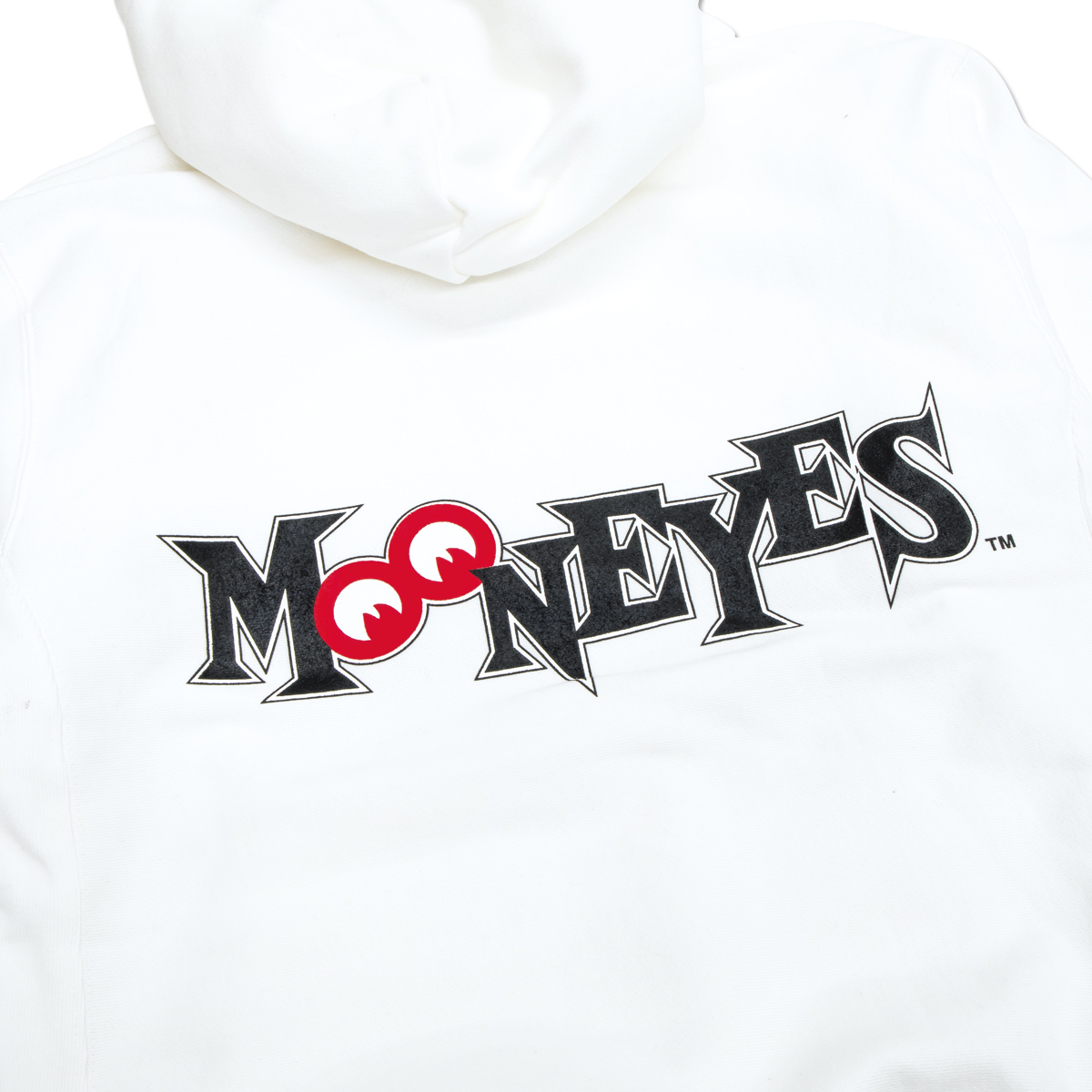 Across the back, the distinctive MOONEYES logo stands out in sharp, pointy font. On the front, the fusion of the pointy MOONEYES logo and the Eyeshape logo creates a dynamic design that captures attention.
