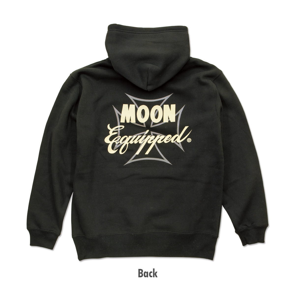A pullover hoodie featuring the gray line iron cross and MOON Equipped name logo decorating the back printing.