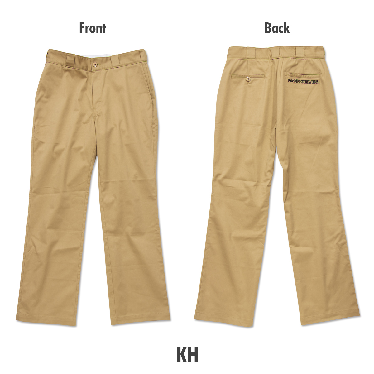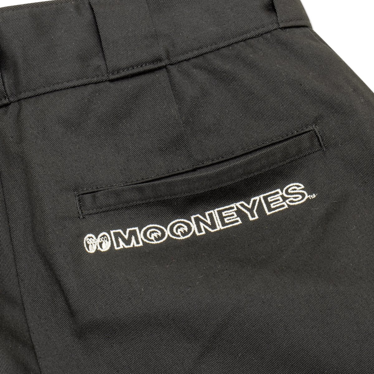 A work pants feature a subtle MOONEYES embroidery on the back pocket as a simple accent.