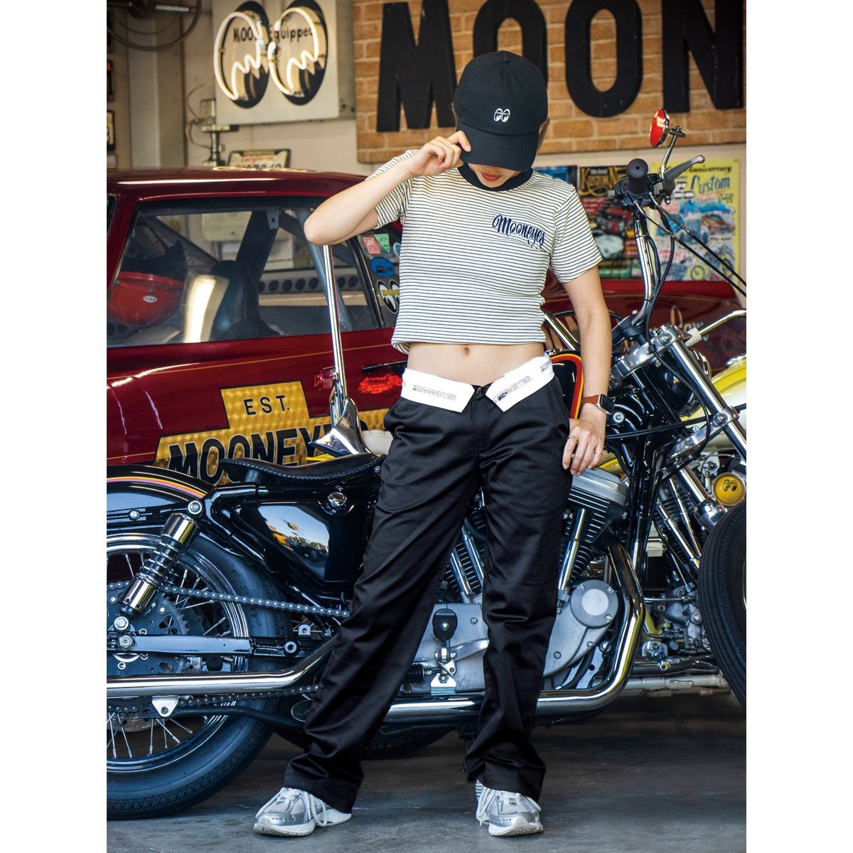 Available in two easy-to-pair colors, black and khaki, they also have a hidden accent?when you fold over the waistband, the MOONEYES design wraps around the waist.