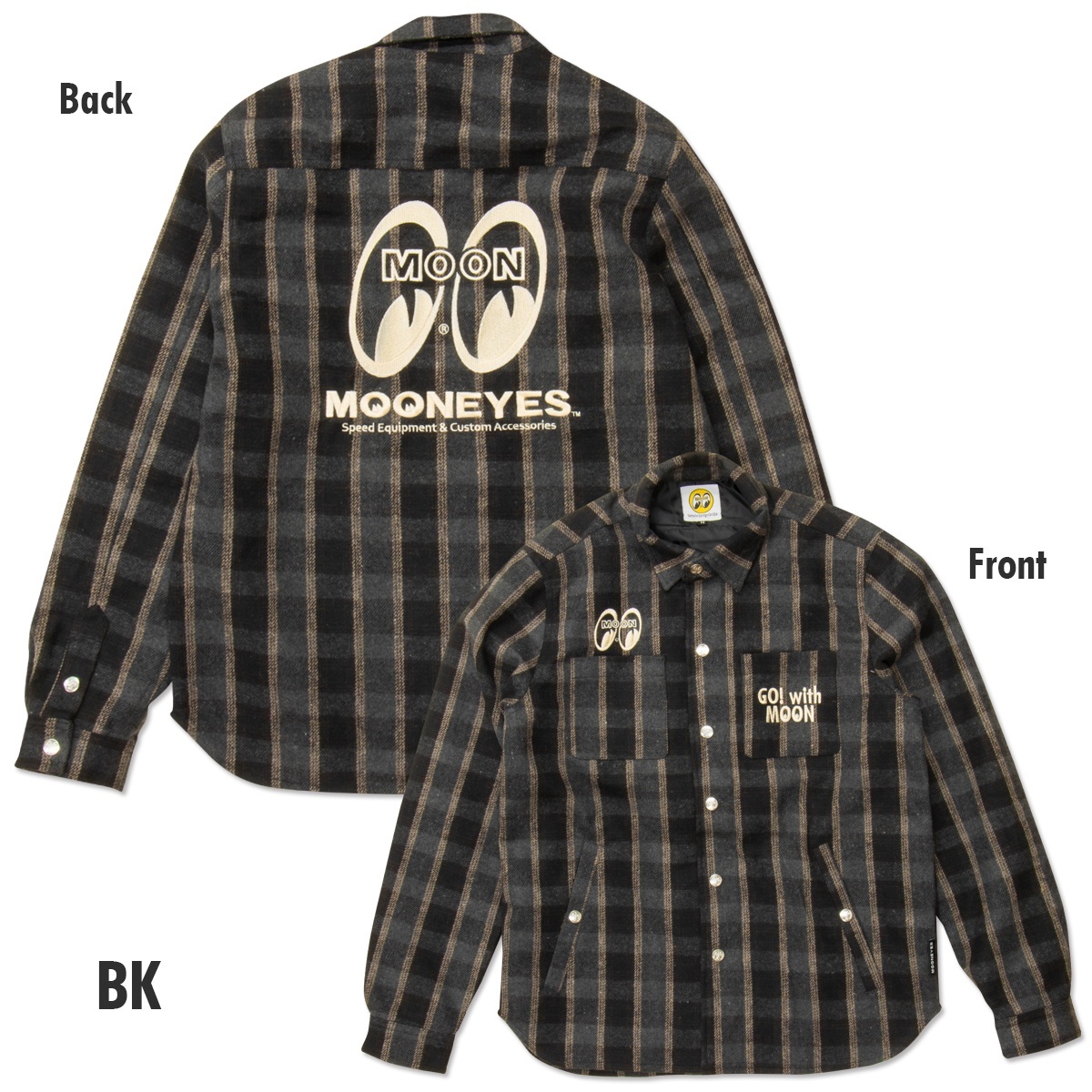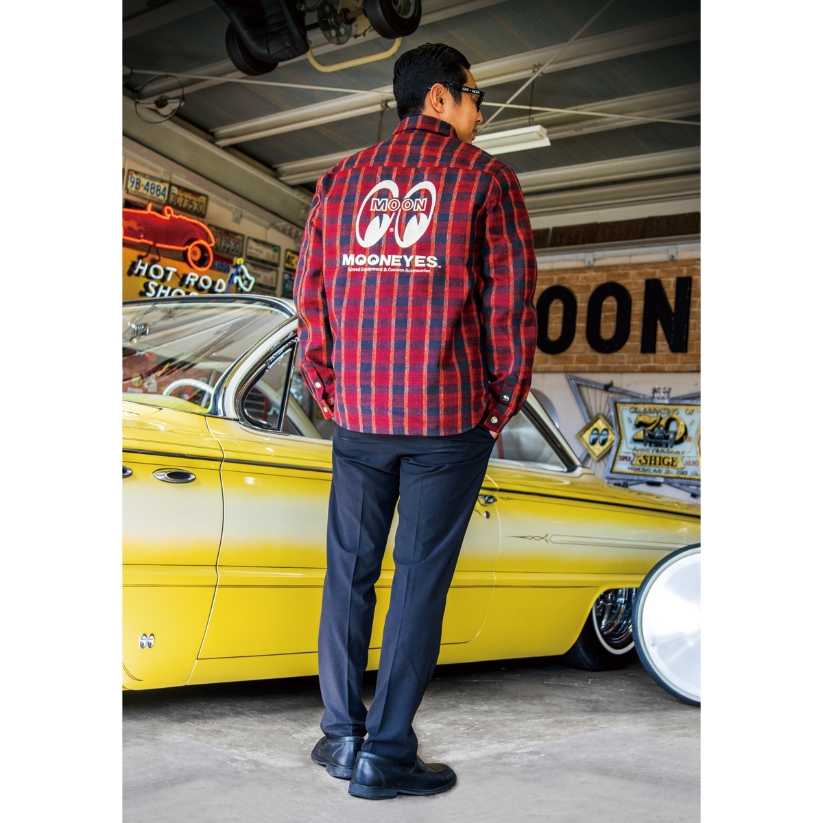 There is a MOONEYES logo on the front as a stitched ornament and, on the back MOON eyeshape logo is largely embroidered.