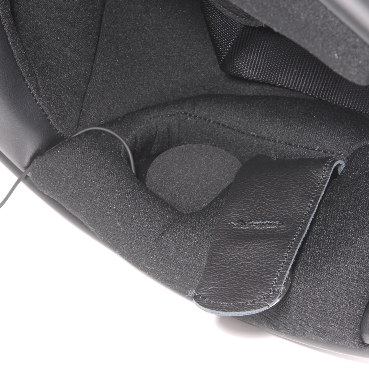 There is space allocated for the speakers of the intercom system. The speaker size is compatible with most intercoms. The chin strap is made of genuine leather, ensuring durability for long-term use.