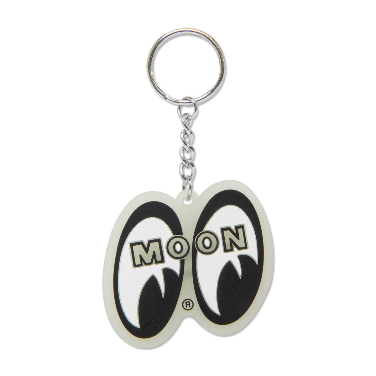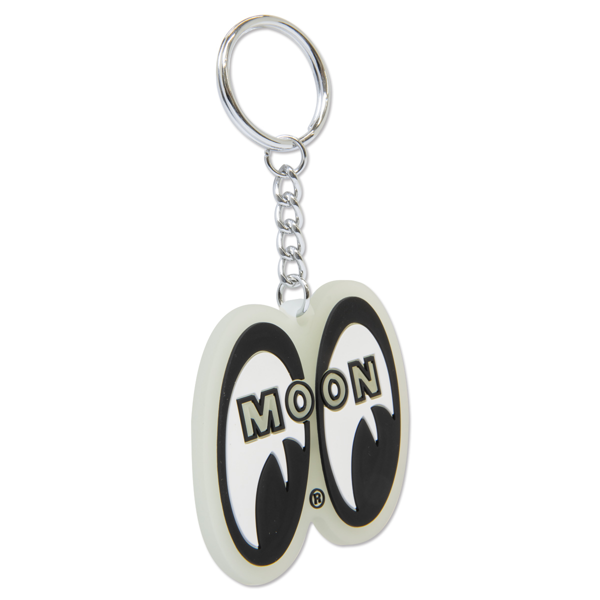 The MOONEYES Eyeshape logo shaped glow-in-the-dark rubber keyring.