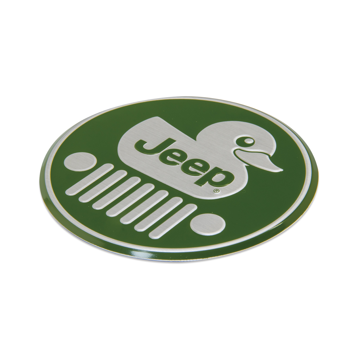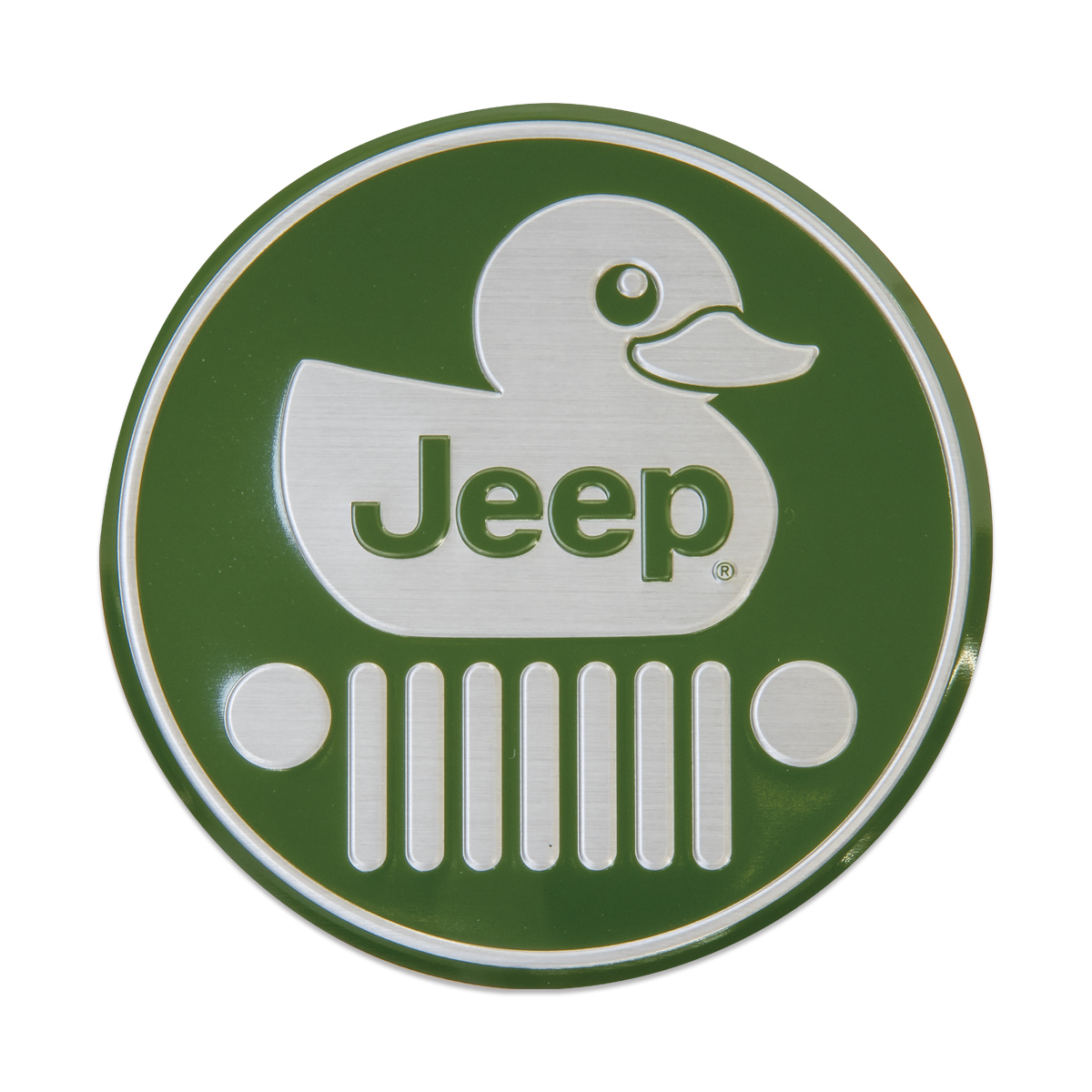 An aluminum decal like an emblem featuring a cute duck design with the Jeep logo.