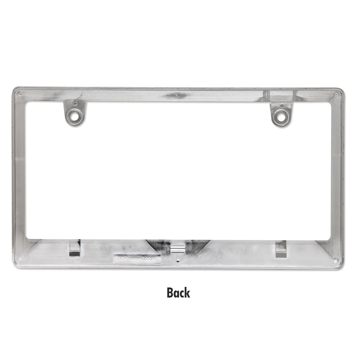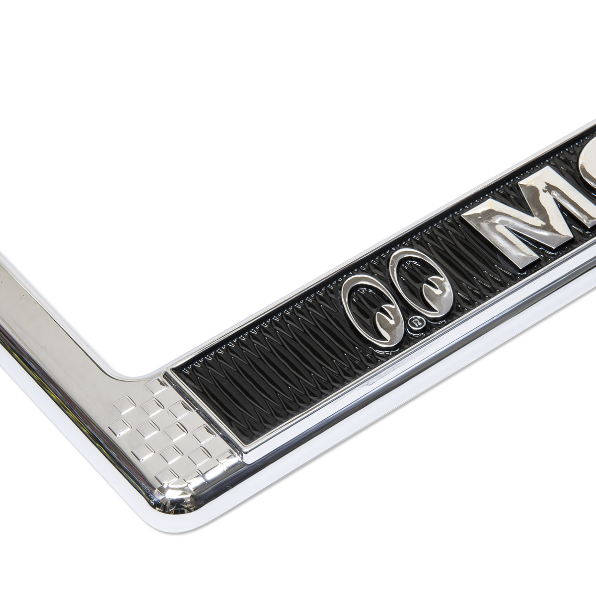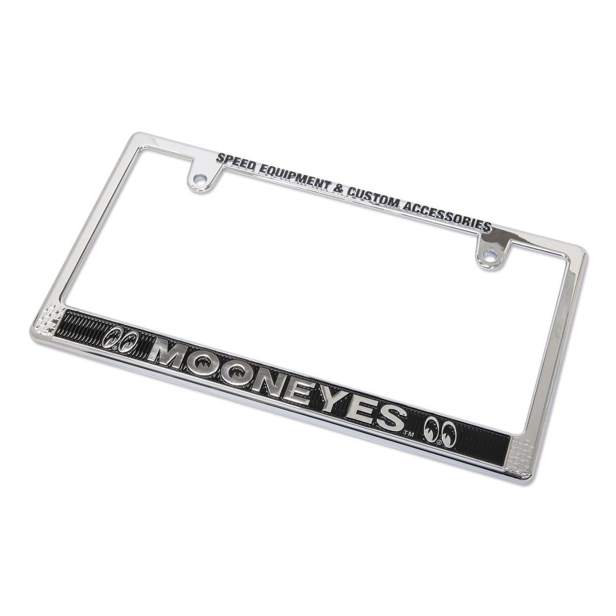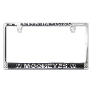 This is a raised MOONEYES license frame with a luxurious chrome finish, smooth to the touch without any roughness on the surface.
