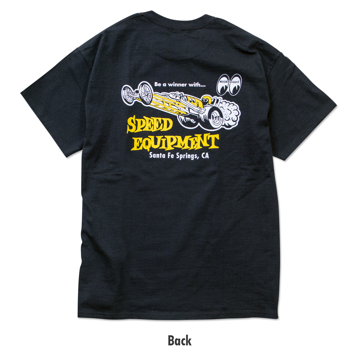 This T-shirt features the MOON Equipped eyeshape logo, the lettering "Be a winner with SPEED EQUIPMENT", and a design of the MOON Dragster.