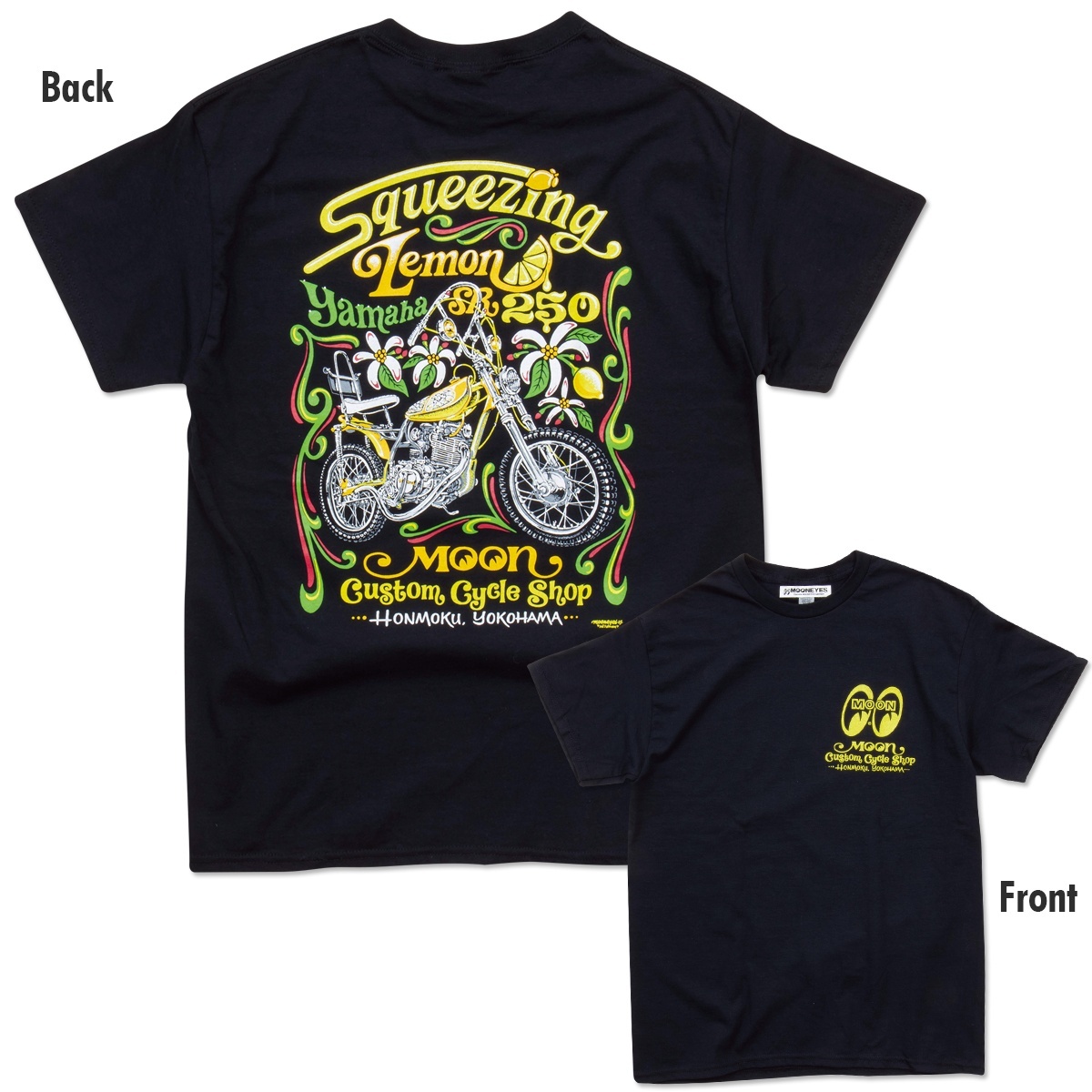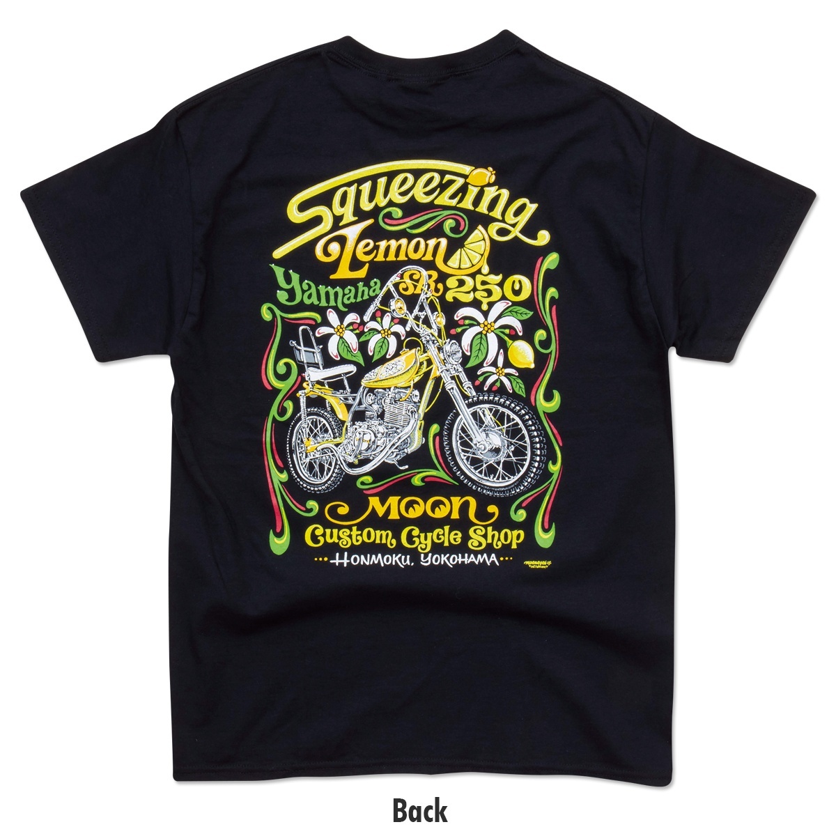 This T-shirt from the MOON Custom Cycle Shop (MCCS) brand features the Yamaha SR 250 "Squeezing Lemon".