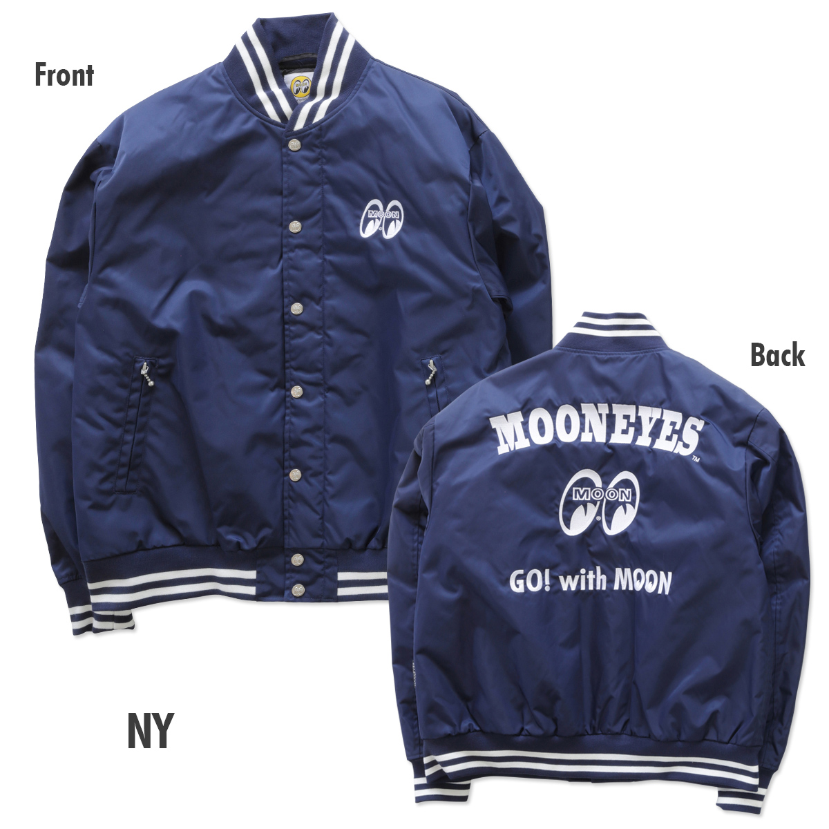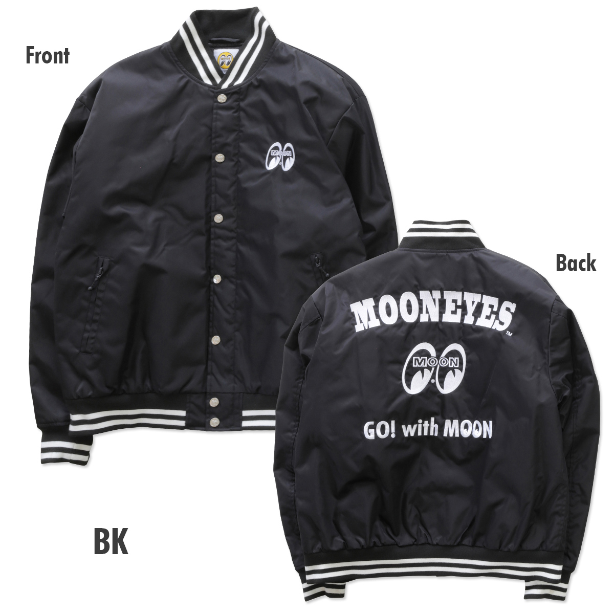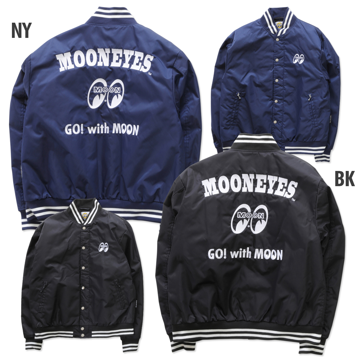 The chest features a one-point MOON Eyeshape logo, while the back is embroidered with both the MOONEYES Eyeshape and GO! with MOON logos.