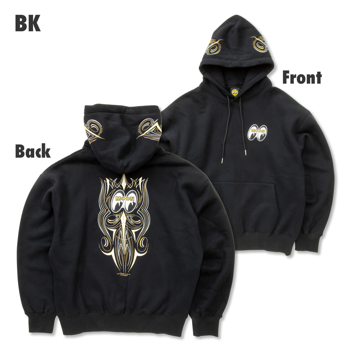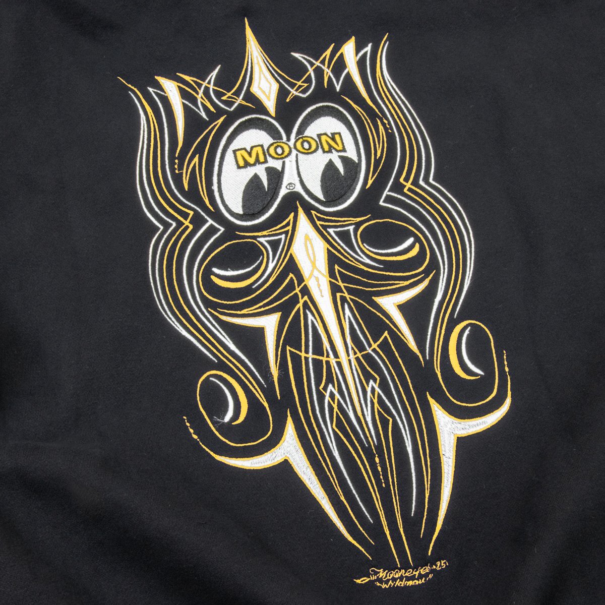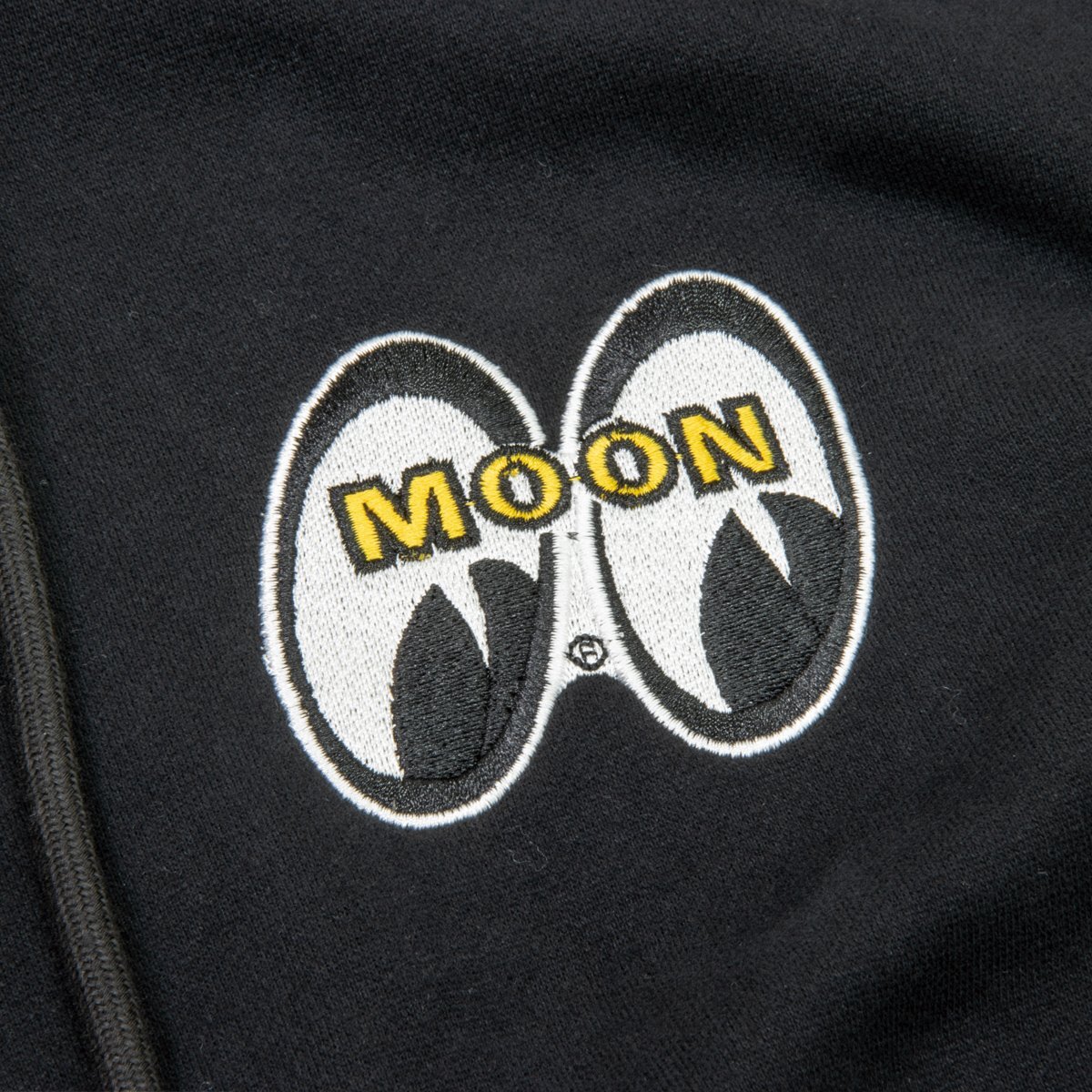 The carefully executed embroidery captures the hand-drawn beauty of each line, giving the design a dimensional and expressive look. Bold pinstripes on the back, while a subtle accent appears on the hood. On the front chest, a small embroidered MOON Eyeshape log adds a touch of catchy presence.
