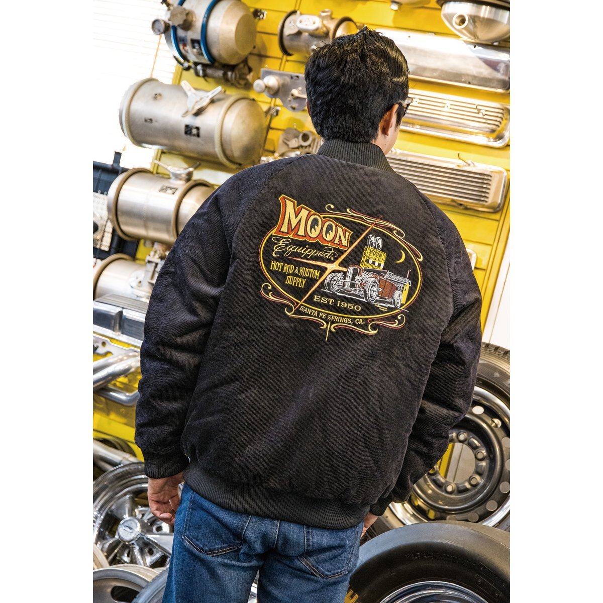 This jacket features a design centered around the iconic building and Roadster of the MOON Equipment Co., founded in 1950 by Dean MOON in Santa Fe Springs, California, USA.