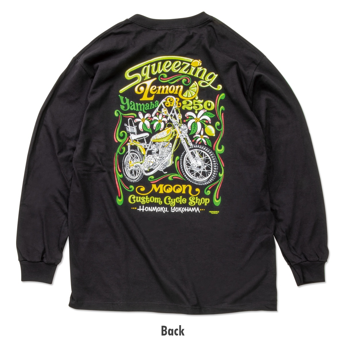 This long sleeve T-shirt from the MOON Custom Cycle Shop (MCCS) brand features the Yamaha SR 250 "Squeezing Lemon".
