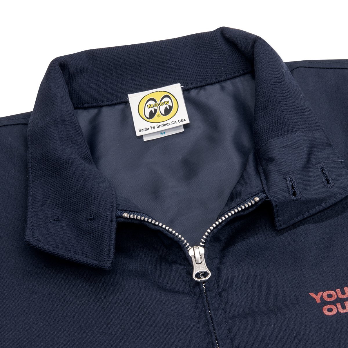 A zip-up Harrington jacket featuring a bold MOONEYES YOKOHAMA logo across the back in a CQQL silhouette.