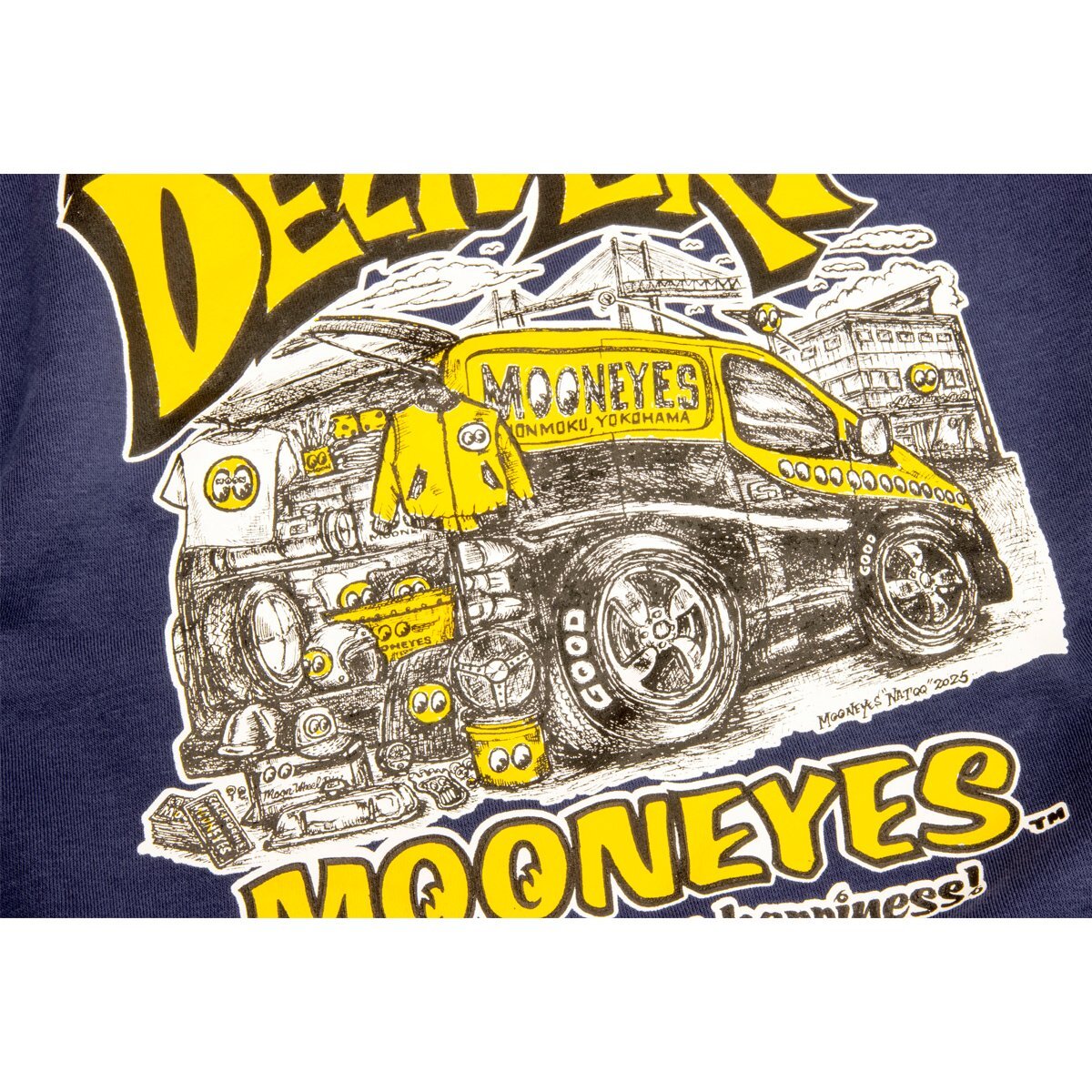 This joyful artwork features the bed of the much-talked-about Nissan NV200 Vanette, customized by MOONEYES, packed full of MOONEYES items. In the background, you’ll spot MOONEYES Area-1 and the iconic Yokohama Bay Bridge, both representing the spirit of Yokohama.