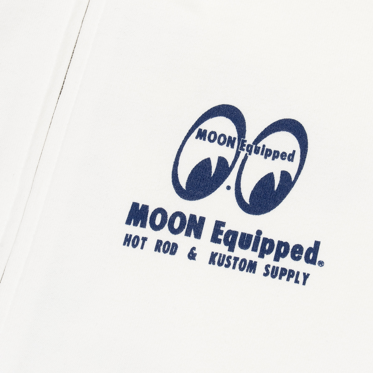 This familiar look features a small MOON Equipped Eyeshape logo and the "HOT ROD & KUSTOM SUPPLY" lettering on the front, while the back makes a bold statement with the traditional MOON Equipment Co. Speed Shop logo.