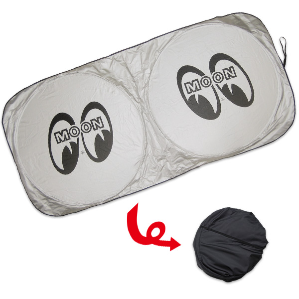 The best way to keep the heat and damaging sun rays out of your ride is with this super sunshade featuring the MOON logo print with facing "eyes". The two wire rings make it easy to fold up with a twist and fits just about anywhere. Photo shows the sunshade in use on a Dodge (full size window).