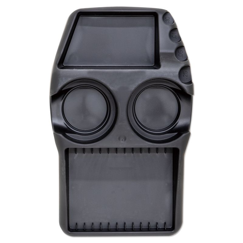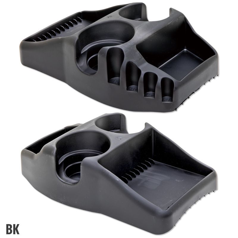 2 cup holders and 2 coins slots and on the front and back there is storage space to put your small items and CDs. It can contain 13 CDs.