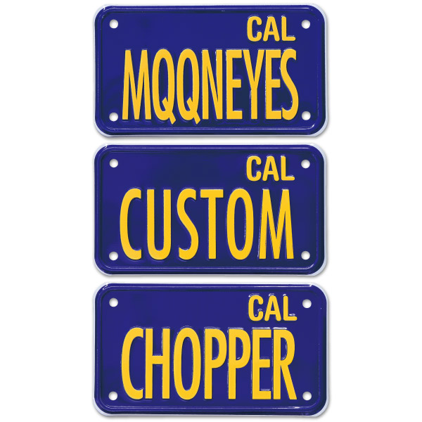Blue and yellow California license plates with MQQNEYES, CUSTOM or CHOPPER. Each sold separately.