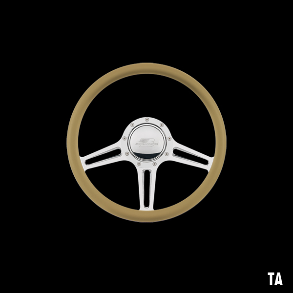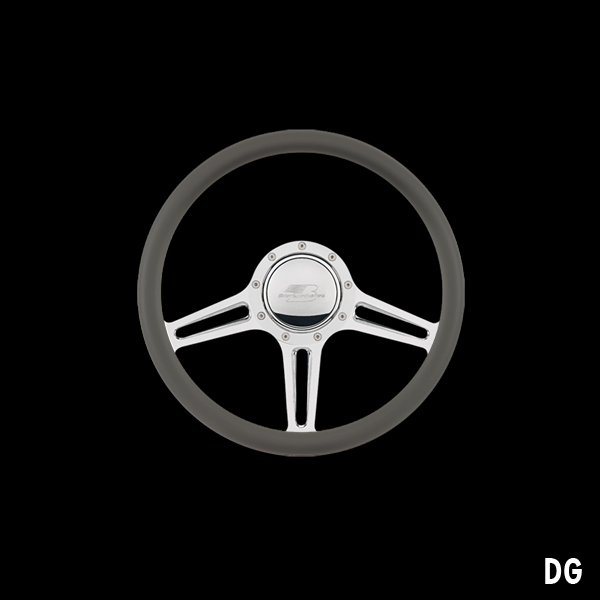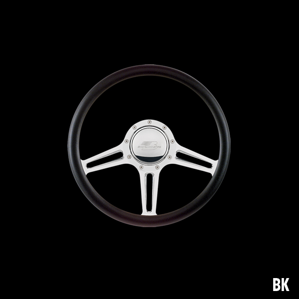 The steering wheel features a seamless (no seams) half-wrap leather grip. The front half leather and the back half is billet aluminum with finger grooves. Size is 14 inches (35 cm) in diameter and available in 5 colors.