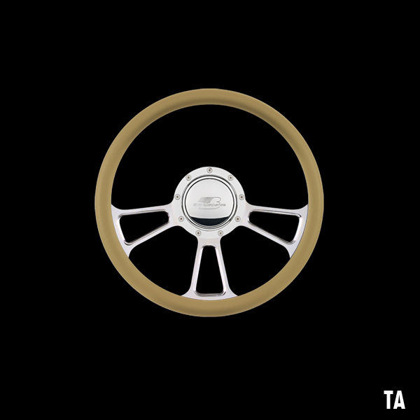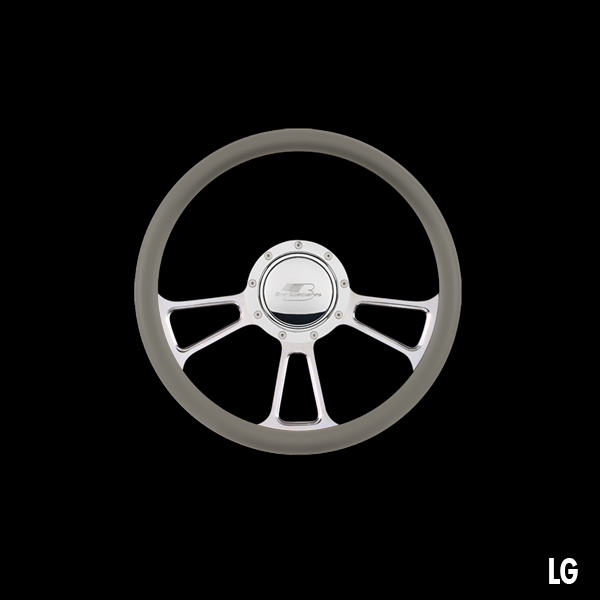 The steering wheel features a seamless (no seams) half-wrap leather grip. The front half leather and the back half is billet aluminum with finger grooves. Size is 14 inches (35 cm) in diameter and available in 5 colors.