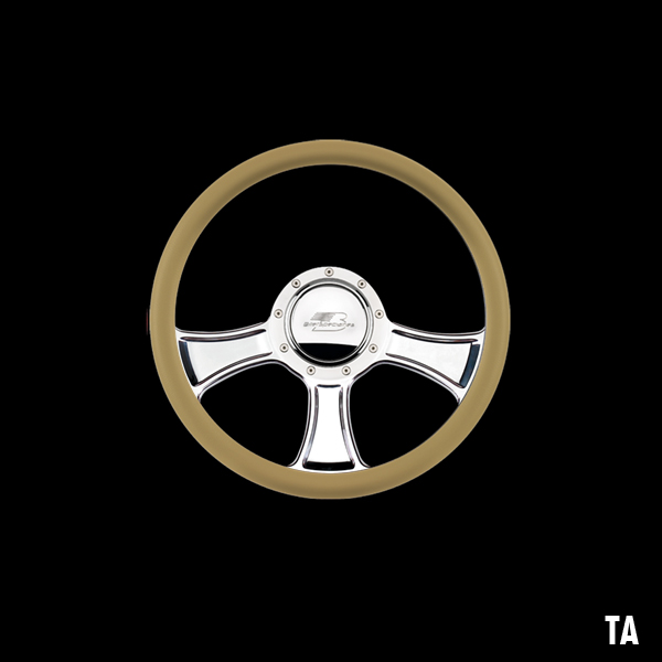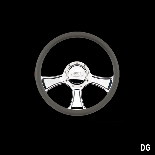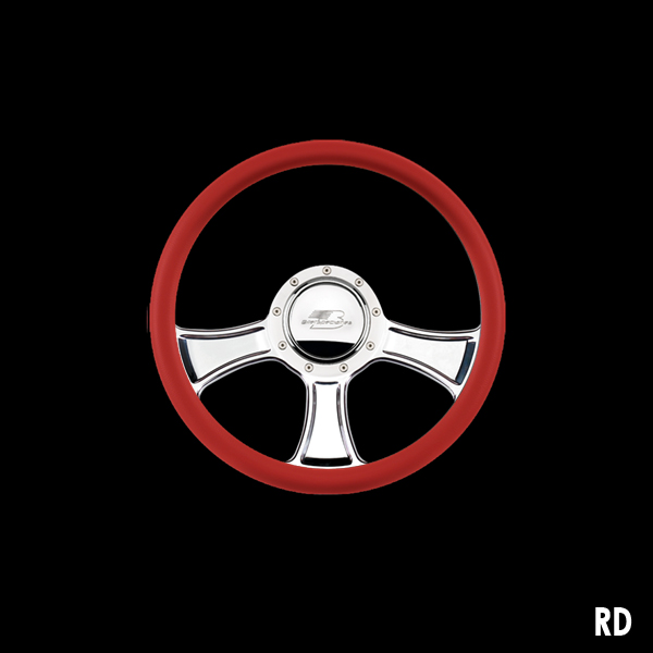 The steering wheel features a seamless (no seams) half-wrap leather grip. The front half leather and the back half is billet aluminum with finger grooves. Size is 14 inches (35 cm) in diameter and available in 5 colors.