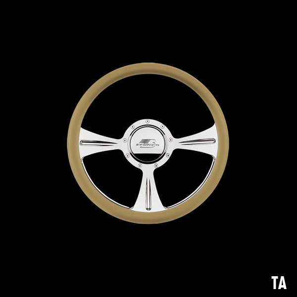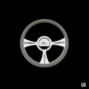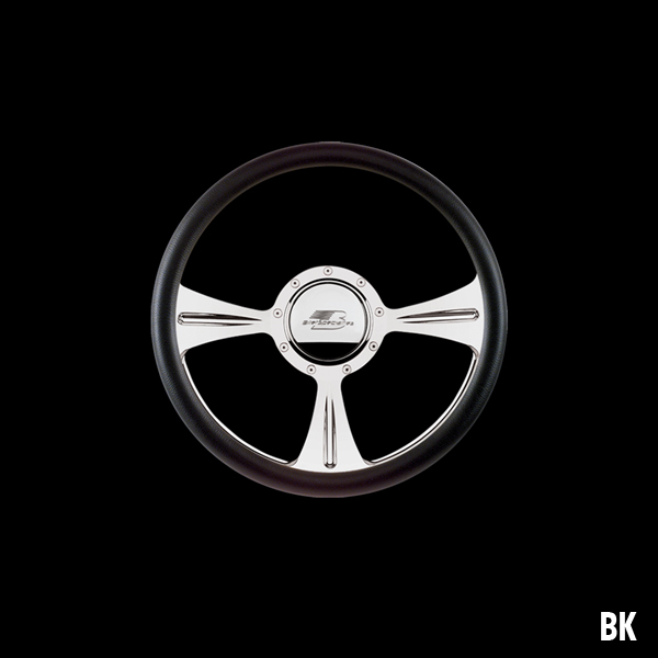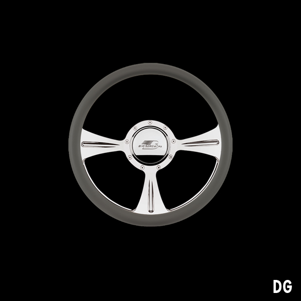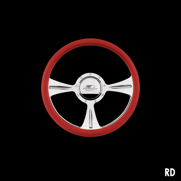 The steering wheel features a seamless (no seams) half-wrap leather grip. The front half leather and the back half is billet aluminum with finger grooves. Size is 14 inches (35 cm) in diameter and available in 5 colors.