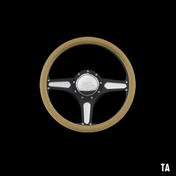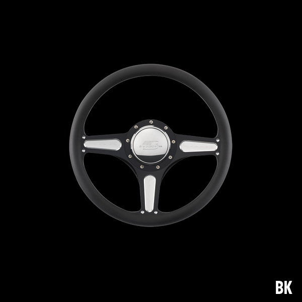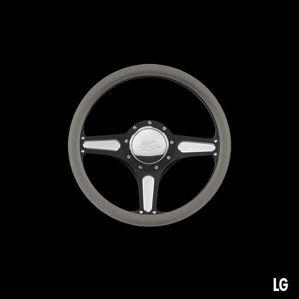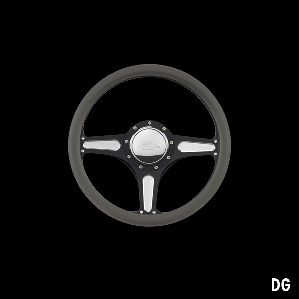 The steering wheel features a seamless (no seams) half-wrap leather grip. The front half leather and the back half is billet aluminum with finger grooves. Size is 14 inches (35 cm) in diameter and available in 5 colors.