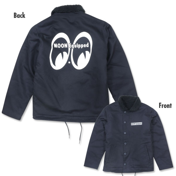 Jacket with MOON Equipped logo patch on the front and large MOON Equipped logo printed on the backside. Boa on the inside and the inner side of the sleeve is ribbed so it will protect you from cold weather. There is cord to adjust the hem of the jacket to prevent the wind coming in. If you turn up the collar it will cover up your neck so it is recommended to wear it when you are riding motorcycles. On both of the underarm there is a hole, so it breathes well.