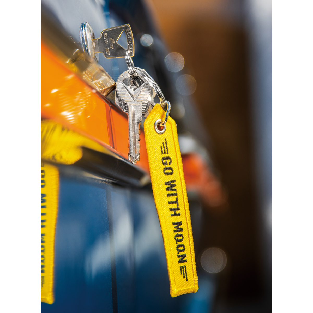 Canvas cloth tag with "Go WITH MQQN" and on the other side "MQQNEYES SPEED EQUIPMENT" and eye shape embroidered strap key chain.